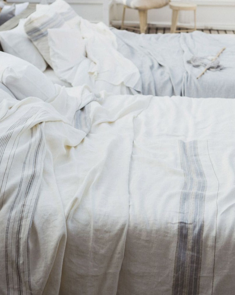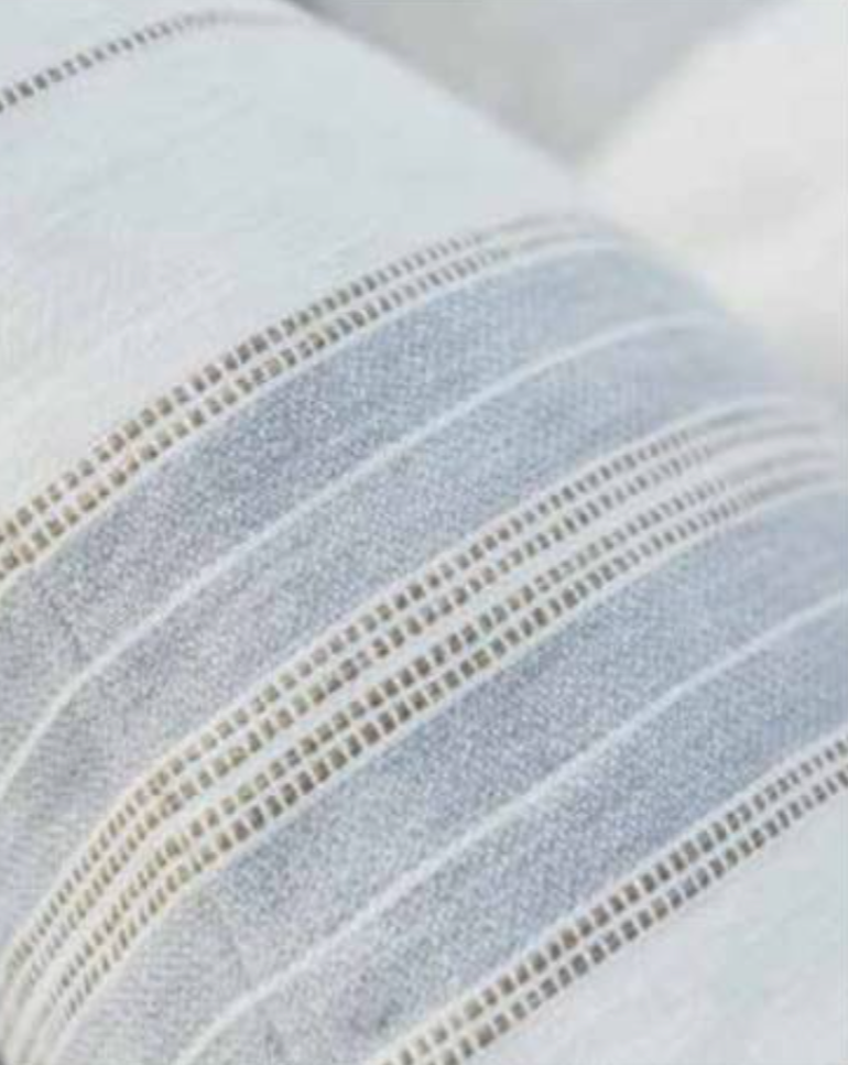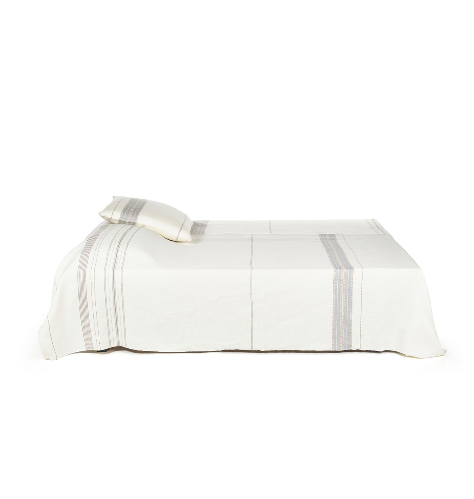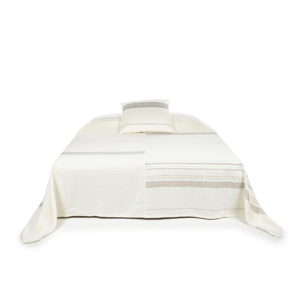 This linen collection was named after the seaside town of Propriano in Southern Corsica. It’s an ideal linen collection for summer! The coverlet, which is seamed in the middle, is oyster with various specialty yarn stripes running horizontally.