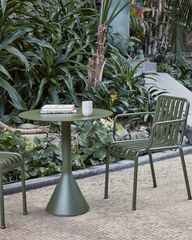 Based on the desire to develop a series of tables to complement the Palissade outdoor furniture collection, French design duo Ronan and Erwan Bouroullec teamed up with HAY to create the Cone Table. Its solid base and ultra-thin steel tabletop share the same graphic design idiom as the rest of the series, enabling the table to be strong without being bulky and elegant without being fragile. The series comprises various sizes with round and square tabletops; all featuring a stabilising concrete base. Specifically designed for outdoor use, the powder-coated steel has a protective outdoor primer for optimal durability and resilience. The collection is available in three different colours and is ideal for terraces, balconies, gardens, cafés and public spaces.