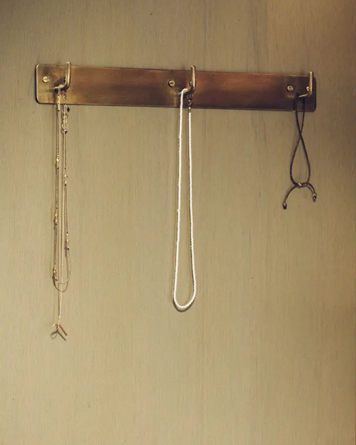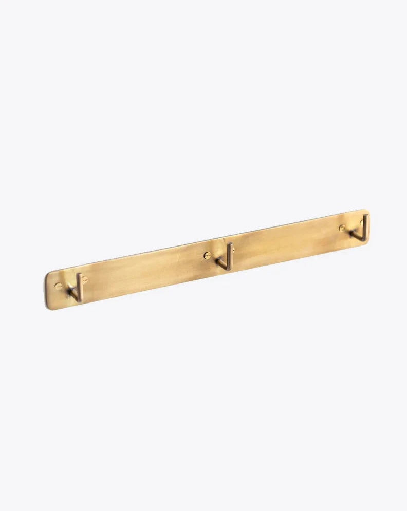 Simple, hand-made wall triple hook in warm, antiqued brass. Useful in the kitchen, bathroom, wardrobe, and more. Useful in the kitchen, hallway, bathroom, office and more.  Brass screws included.