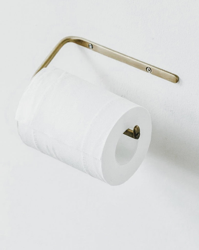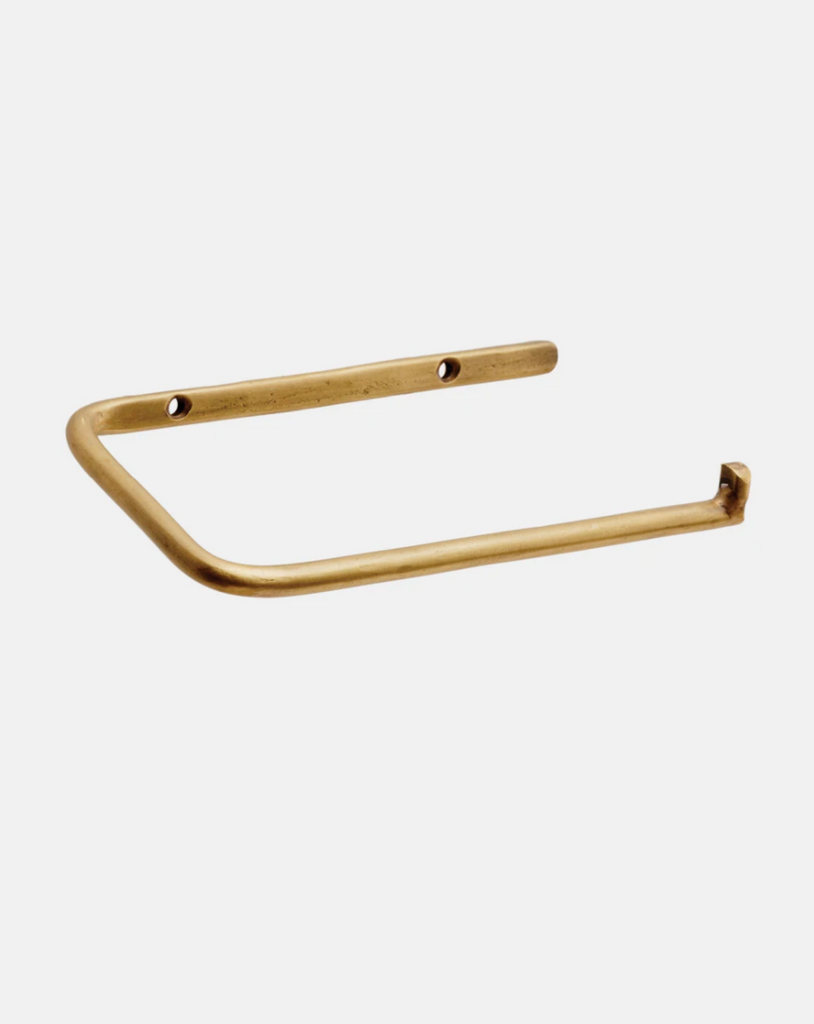 Simple, hand-made toilet paper holder in warm, antiqued brass. Irregularities in finish will occur. Screws are included.