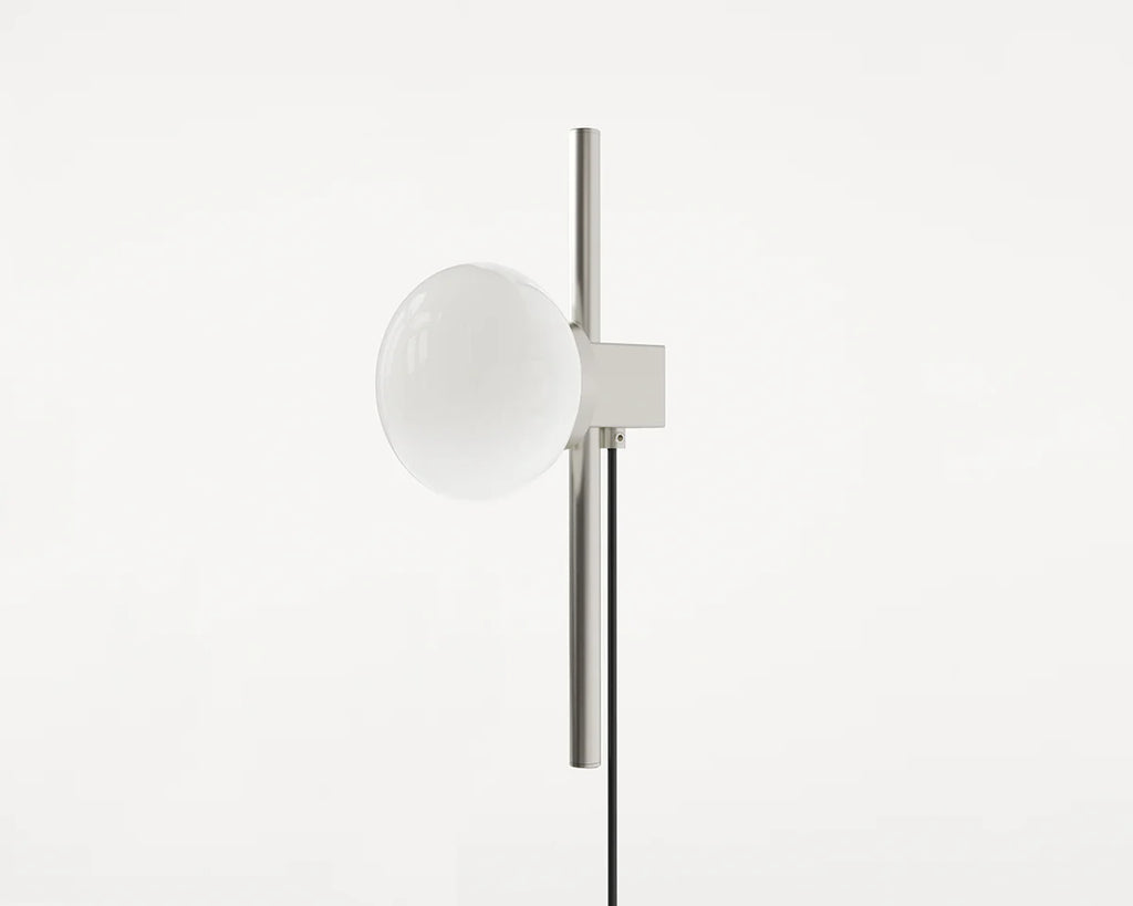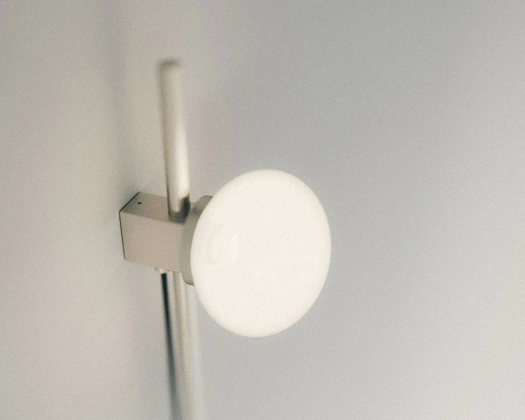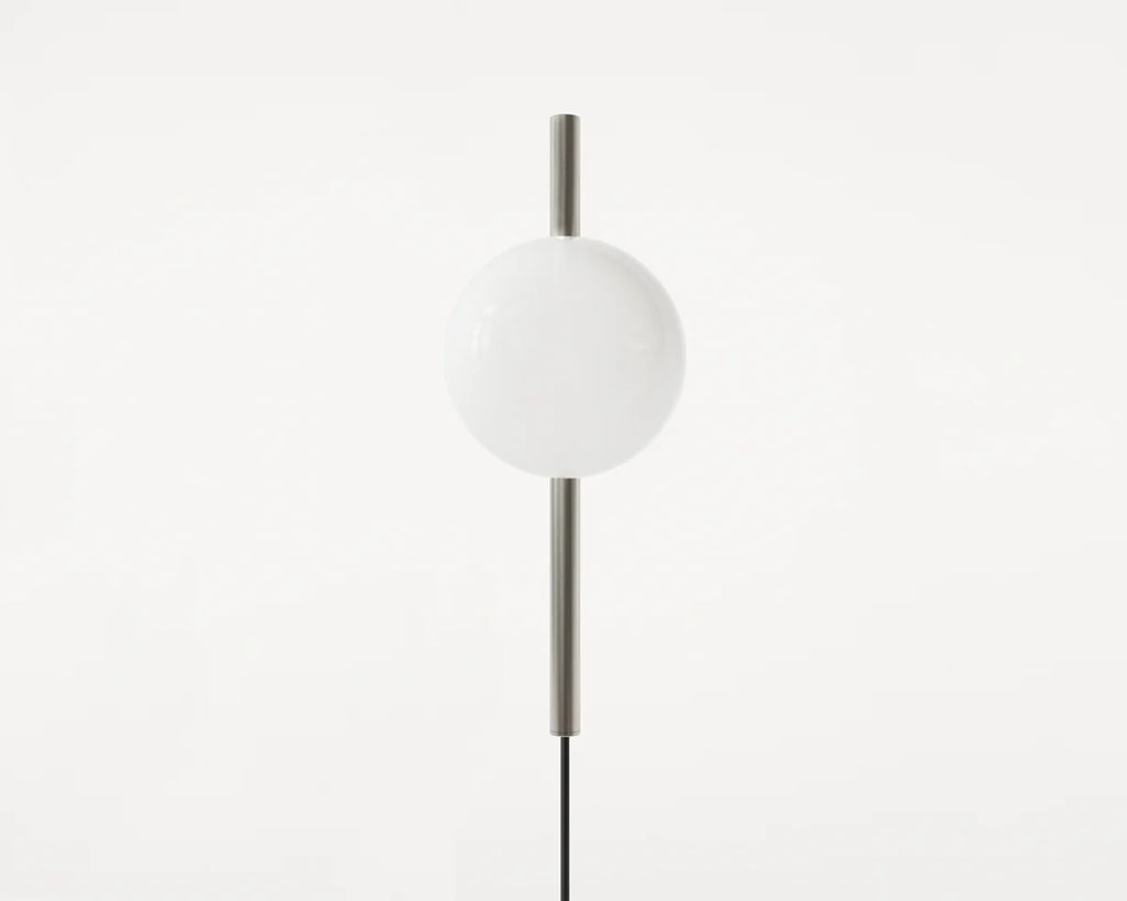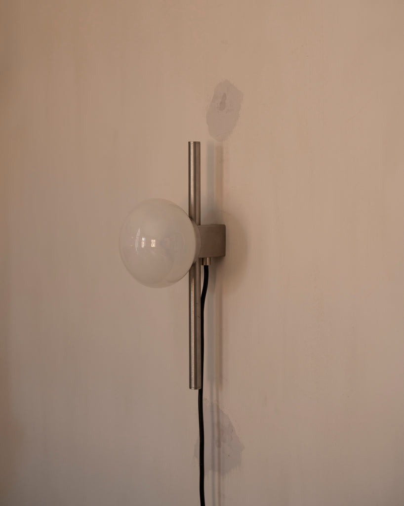 The Ovoid Wall Lamp is a minimal lighting fixture featuring a sleek stainless steel base and a unique hand-blown glass sphere. Perfect for mounting on walls where subtle light is needed.