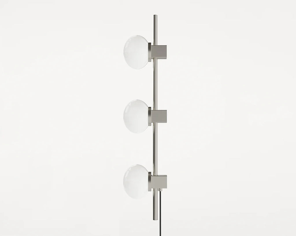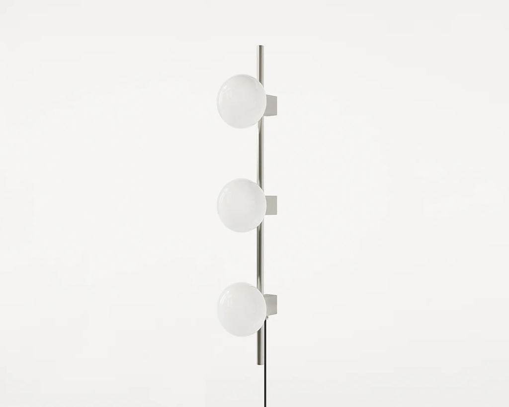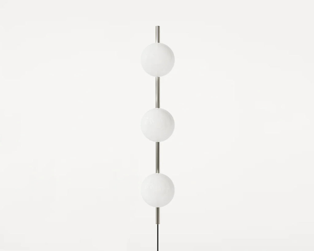 The Ovoid Wall Lamp Triple is a minimal lighting fixture featuring a sleek stainless steel structure and three unique hand-blown glass spheres. Perfect for mounting on walls where light is needed.