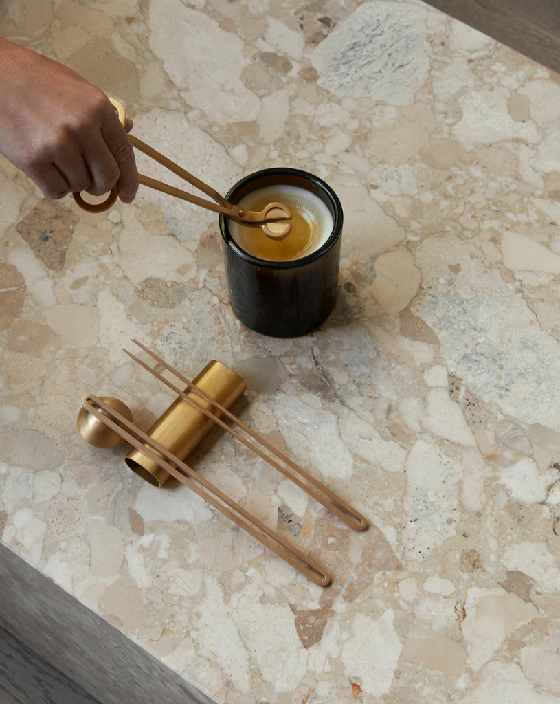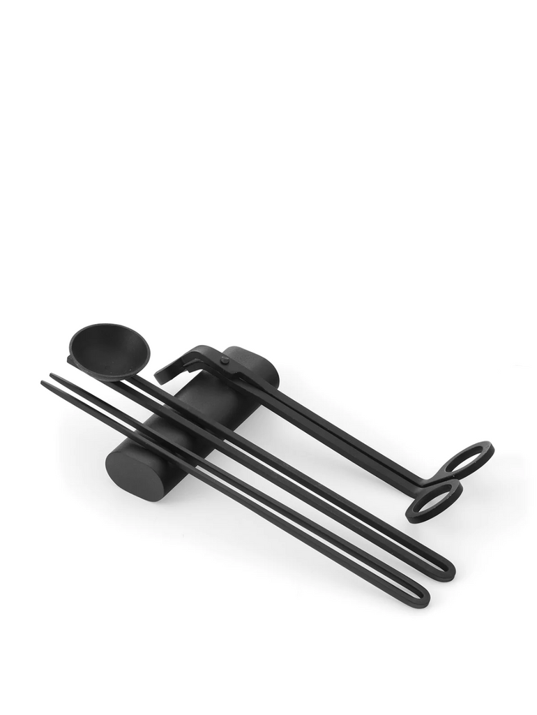 Designed for optimal candle care and performance, the four-piece Candle Care Kit includes elegant tools in powder-coated metal. A candle snuffer, wick trimmer and pick ensure less smoke and sooting, better burning and the cleaner extinguishing of flames, while the accompanying tray stores the items when not in use.