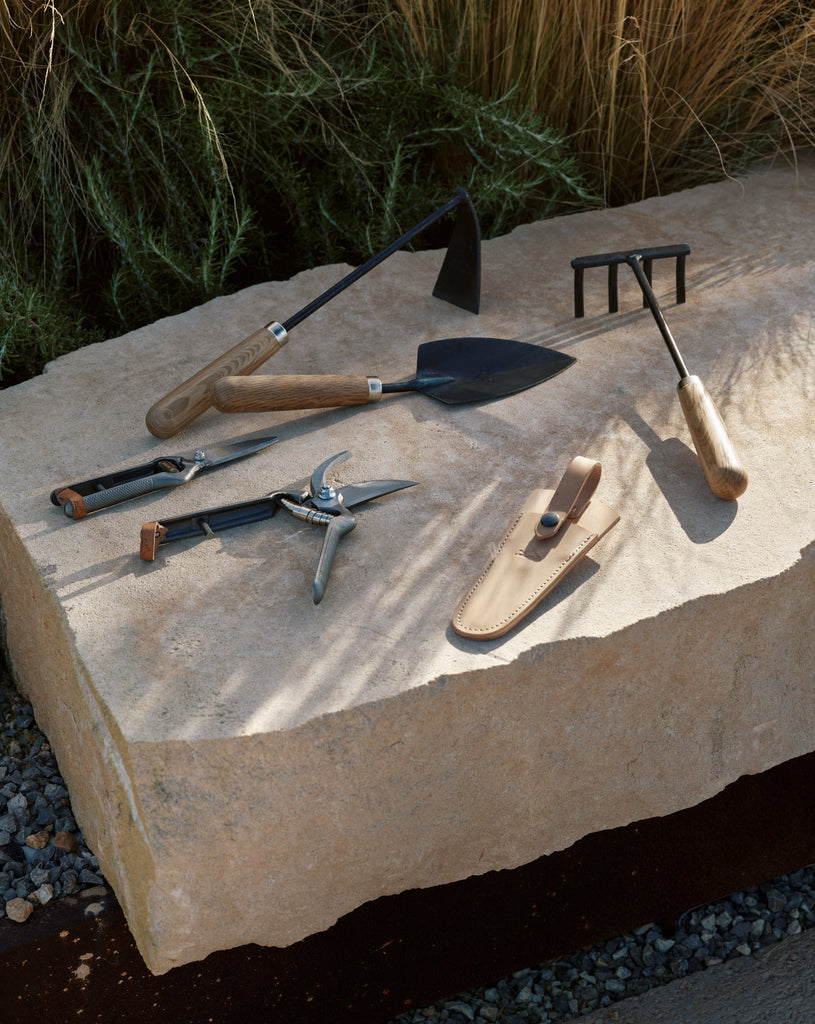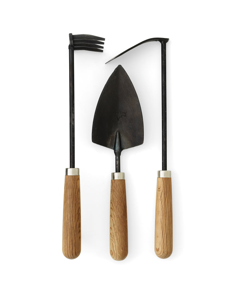 Made exclusively for Audo CPH by Spanish toolmakers Pallarés, a century-old manufacturer of knives and tools of the highest quality.  The elegant 3-piece set includes a trowel, garden fork and hoe —for digging, weeding and preparing soil for planting. Made by hand from carbon steel, each piece bears the hallmarks of fine metal craft. Designed with ergonomics in mind, they are fitted with solid oak handles for a comfortable grip.