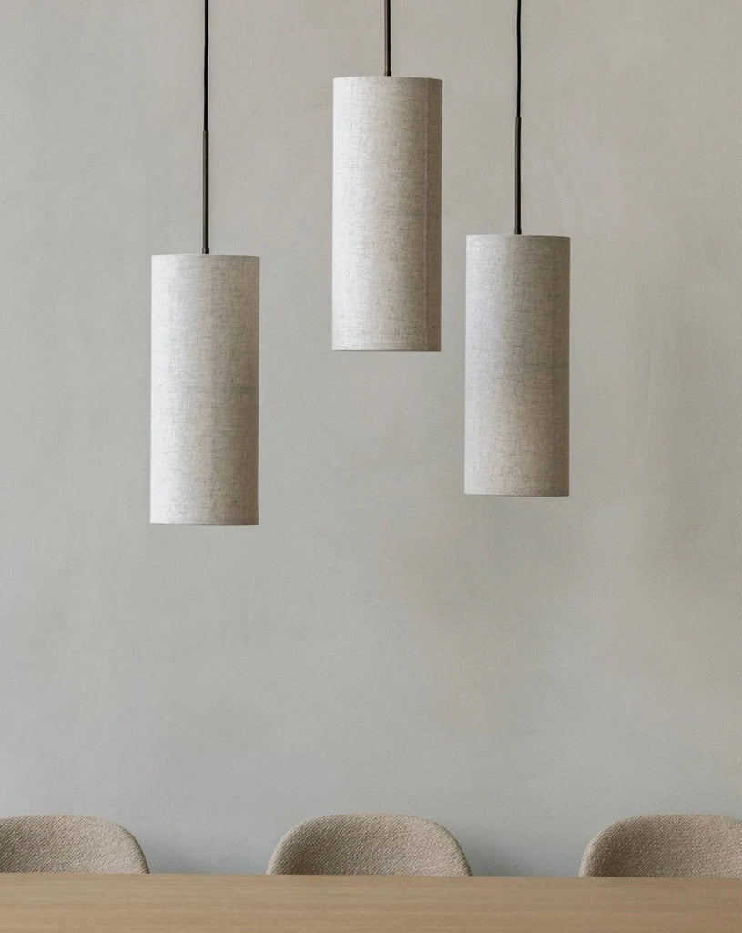The collection’s pendant light is created with the same column-like shape as the floor and table lamp, carefully covered with translucent fabric that reveals the graphic structure within and suspended from the ceiling by a textile cord. Spreading ambient light in a room, it makes a purposeful pendant above a dining table, in a reception area or hotel bedroom.