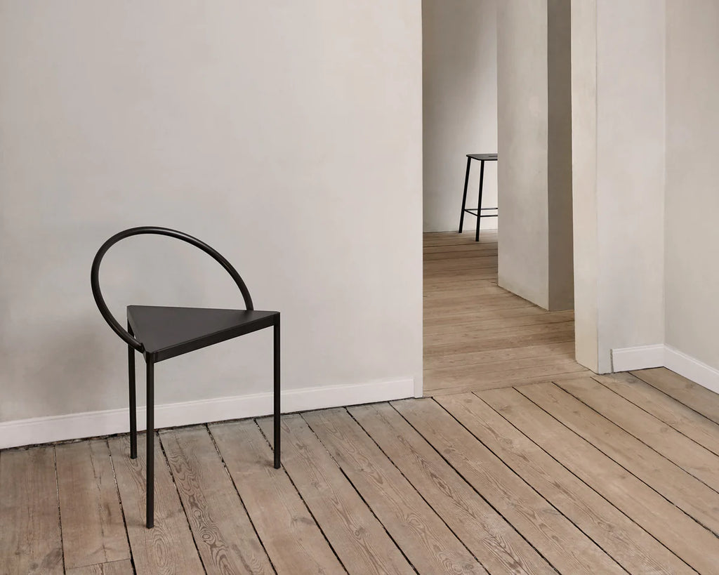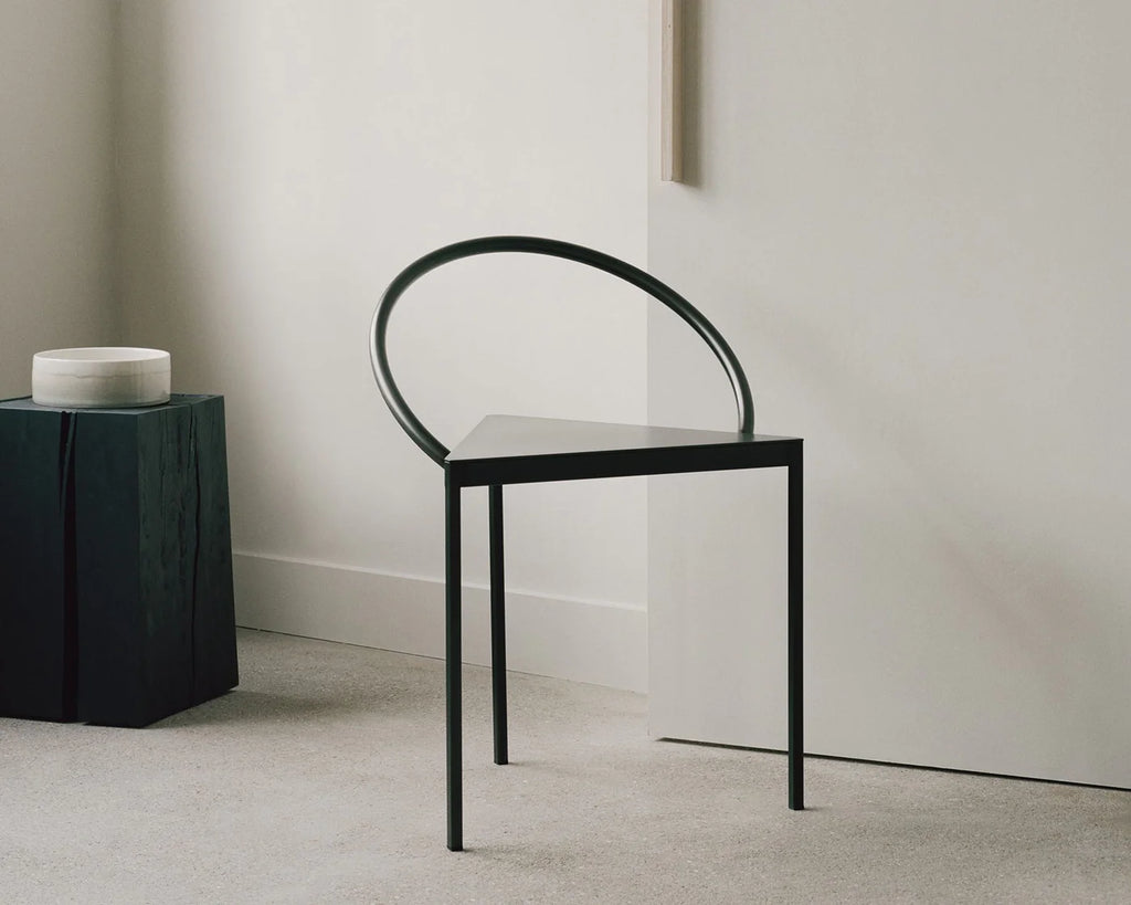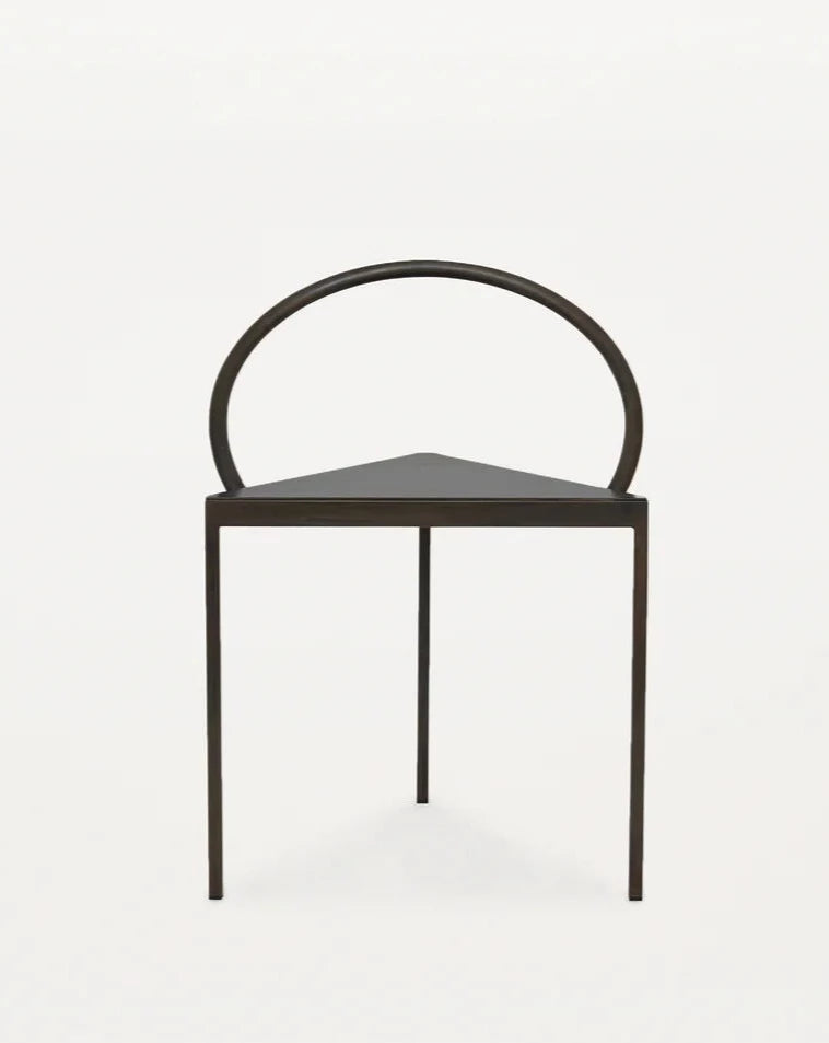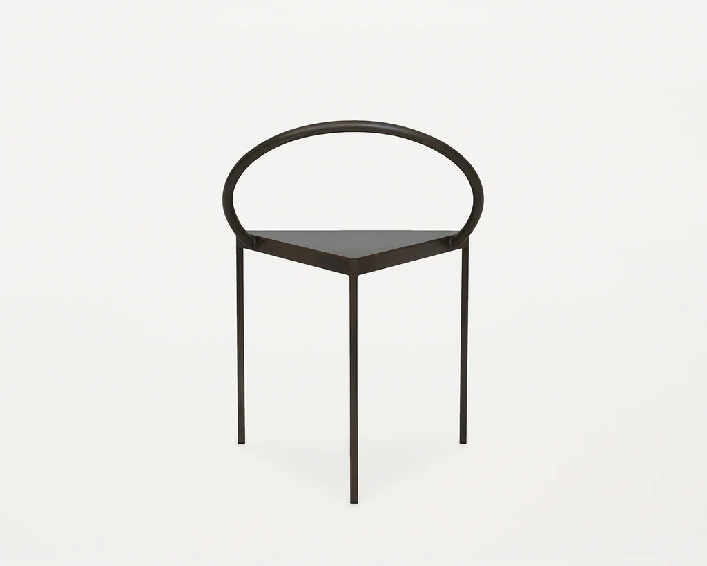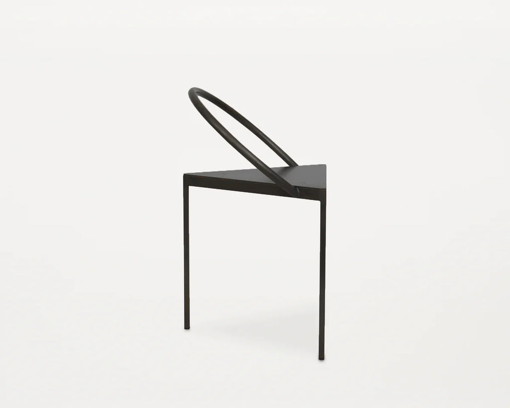 Triangolo Chair, initially conceived by Per Holland Bastrup in 1989 and crafted from stainless steel, is a durable seating item with an industrial aesthetic. The chair features a striking triangular seat, three sleek legs, and a curved tubular backrest. This expressive and sculptural item straddles the line between function and form, serving as seating at a desk or table or as a display piece.