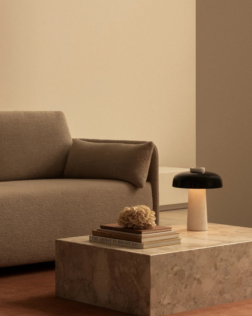 The light diffuses evenly across the unworked stone, left raw to allow the light to highlight its natural imperfections, revealing shadows and an intriguing colour play that seems to stem from the base itself. At precisely the point at which the shade and base meet sits a dimmer switch for adjusting the light intensity. Fitted with a dim-to-warm LED light source, the Reverse Lamp casts warm light on a bedside table or subdued light on a cabinet surface, making it an elegant and characterful solution to a multitude of lighting needs.