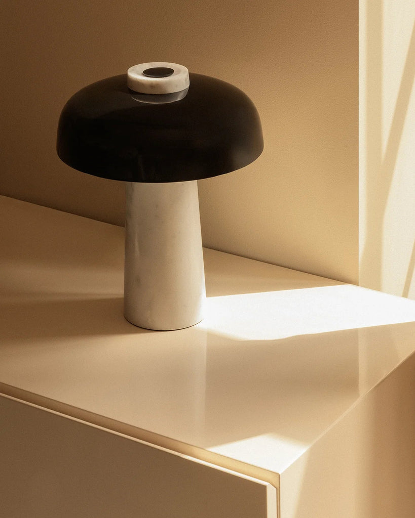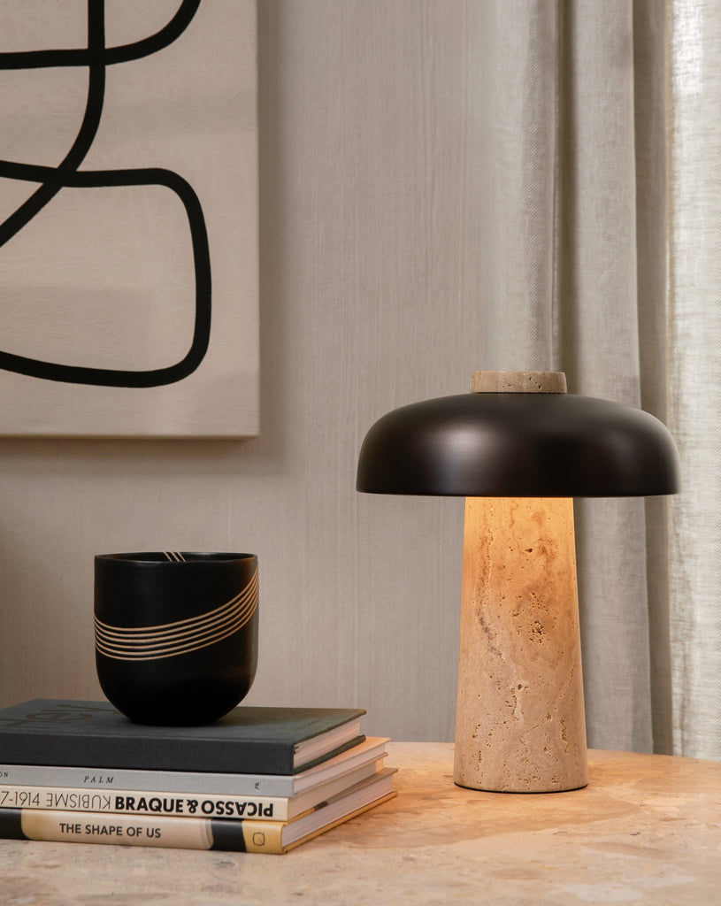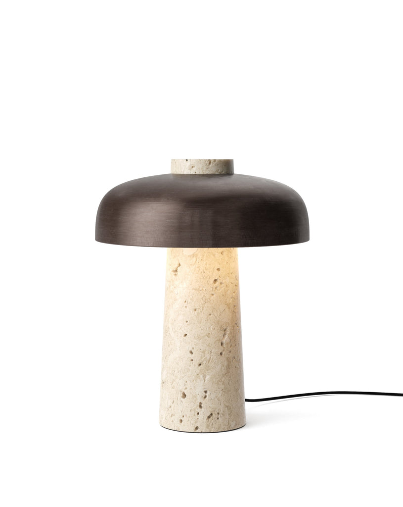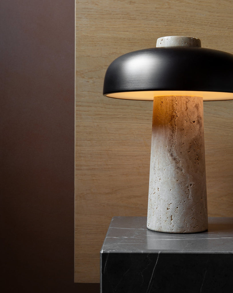 In his search for simple and clever solutions in any given space, Danish designer Aleksandar Lazic looked to Italian marble tables from the 1970s when creating the Reverse Lamp. Inspired by the play on structure created by geometric constraints, the conical travertine base and curved, bronzed aluminium shade define the lamp’s perfectly balanced expression.