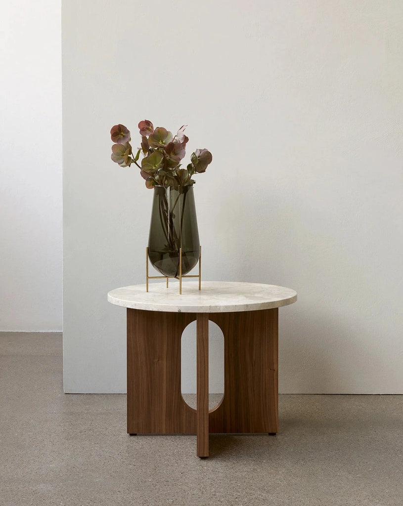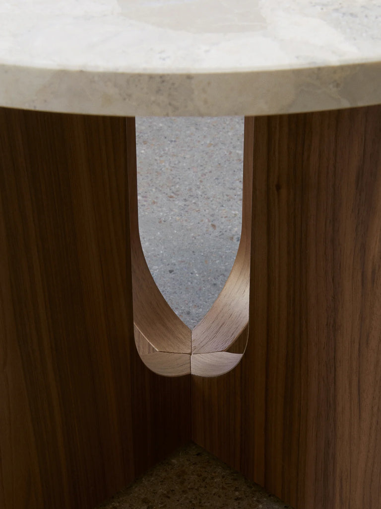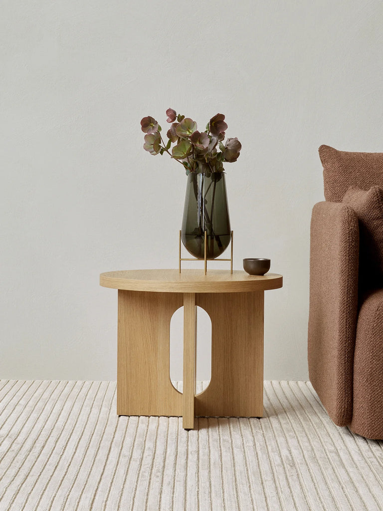 Perfectly proportioned with an intriguing combination of masculine and feminine elements, the Androgyne Side Table is a lesson in contrasts. Making clever use of craftsmanship, the round tabletop overhangs the wide, flat legged base in a meeting of solid and soft lines. Both base and top are sold separately and are available in natural or dark stained oak and Kunis Breccia stone respectively for a complete and customised furniture piece.