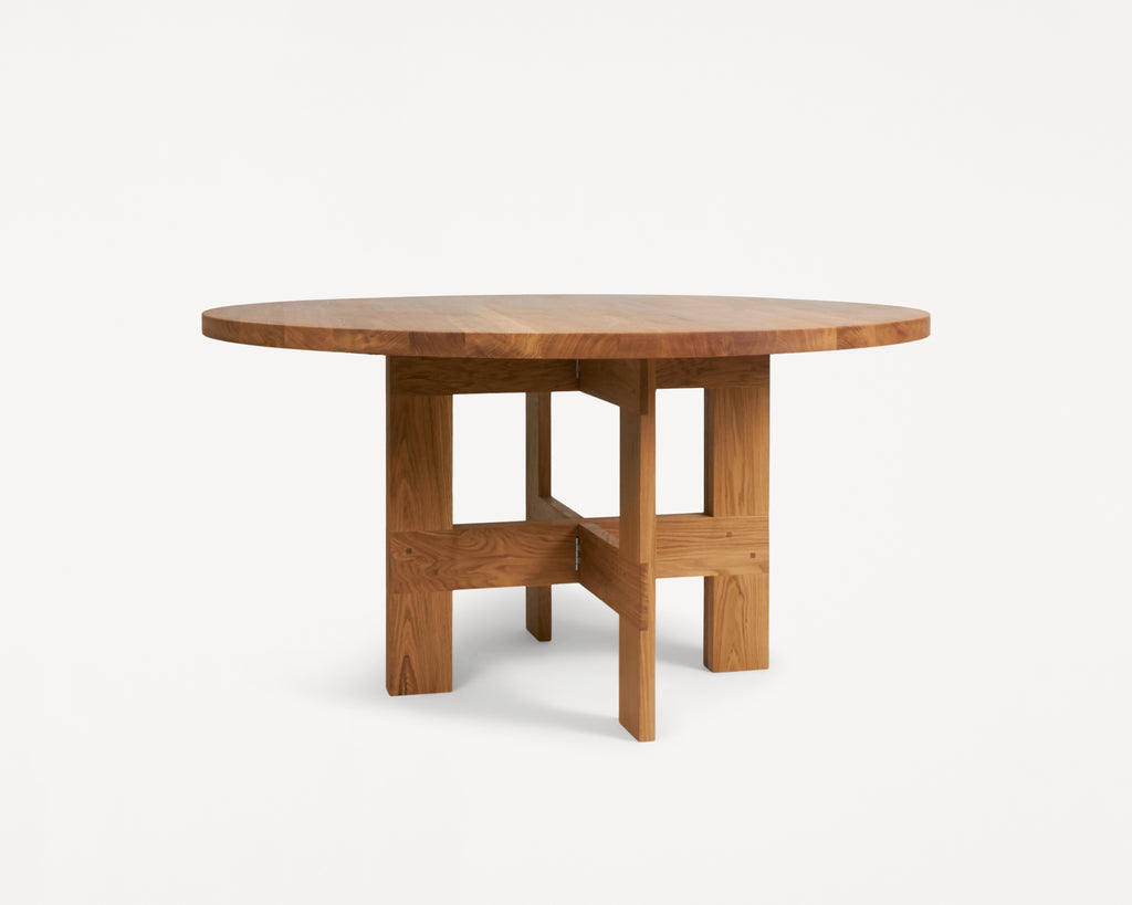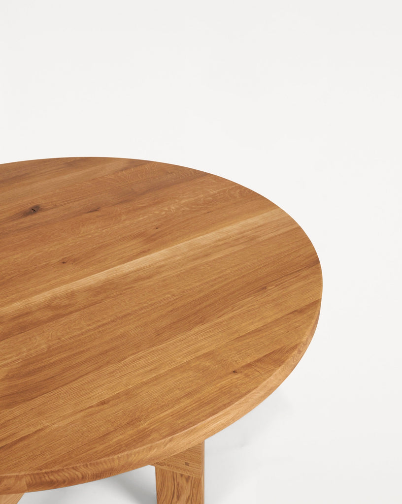 The Farmhouse Trestle Table Round features a round table top crafted in high-quality solid oak. Supported by trestles and inspired by traditional farmhouses with a rural aesthetic, the wooden dining table serves as a focal point in any living space, kitchen, or dining room.