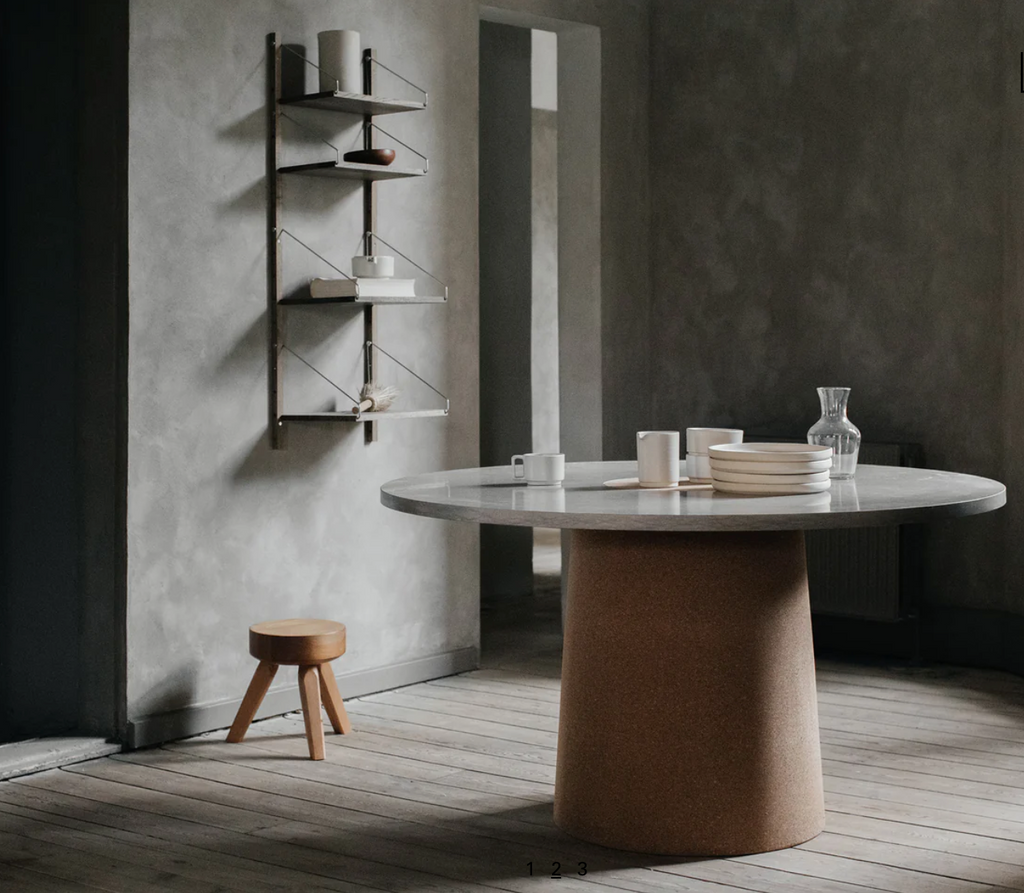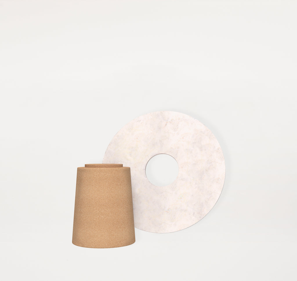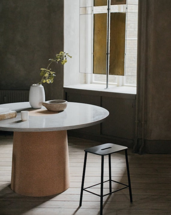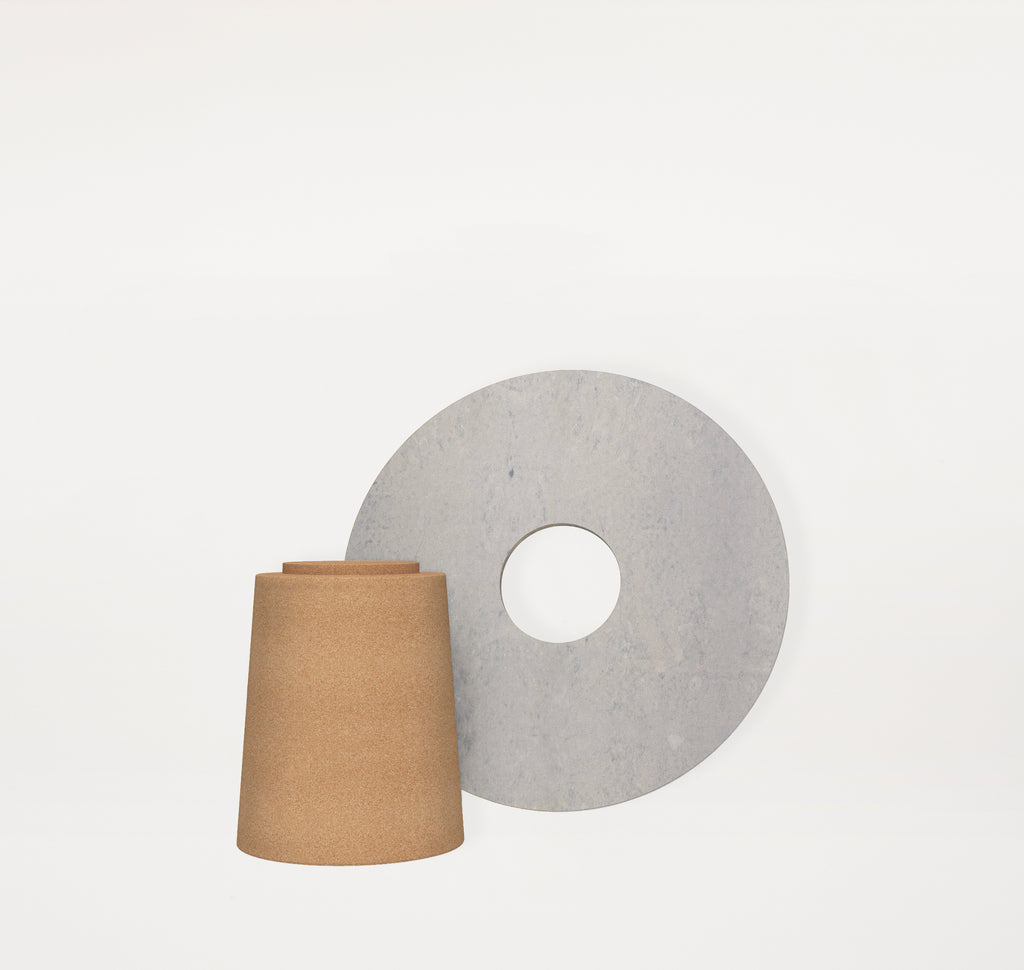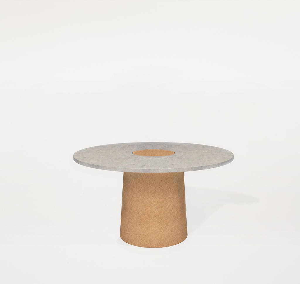 Suitable as a dining or meeting table where the contrast between the soft warm cork, meets the cold smooth marble. The distinction between the two shapes gives the impression of two worlds meeting one another.