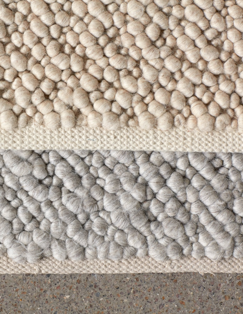 Conveying a sense of nature and celebrating natural materials, the gravel rug combines undyed wool fibres with an unexpected weaving technique that brings depth and complexity to the design.
